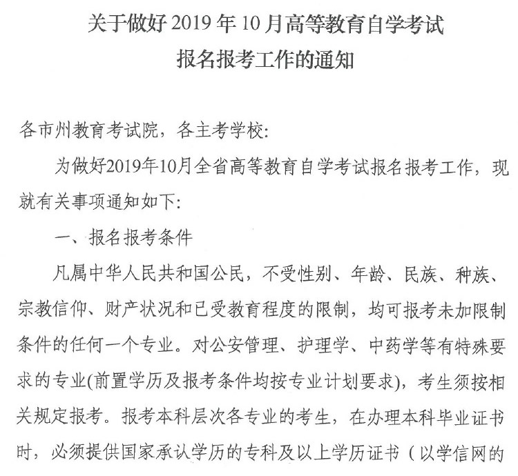 关于做好湖南省2019年10月高等教育自学考试报名报考工作的通知