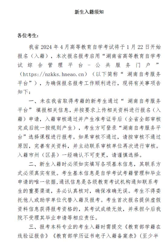 湖南省2024年4月高等教育自学考试新生入籍须知